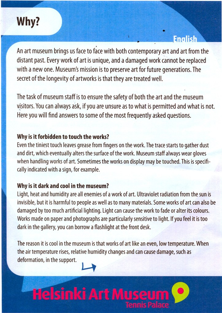 Museums are full of rules. No photography, no eating, no running, no touching the works. ‘No’ features a lot in museum signage, but the Art Museum Tennis Palace in Helsinki takes a simple approach to demystifying all these rules.