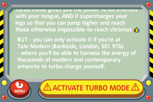 Alongside the strong links to art history in the app, another really clever feature of this game is the emphasis that it places on going to Tate Modern. To access Turbo Power, you have to actually be in the Tate Modern building.