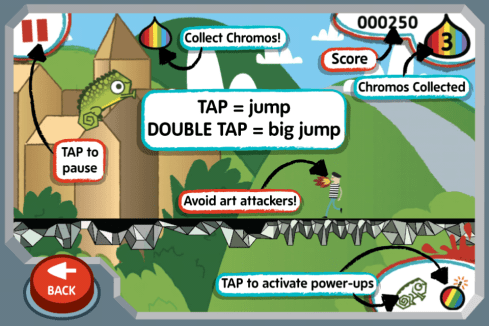 The game is based on an art history timeline with famous paintings appearing through out. As the picture above shows, players can access power ups to help them on their journey, but must avoid obstacles and enemies such as art attackers!