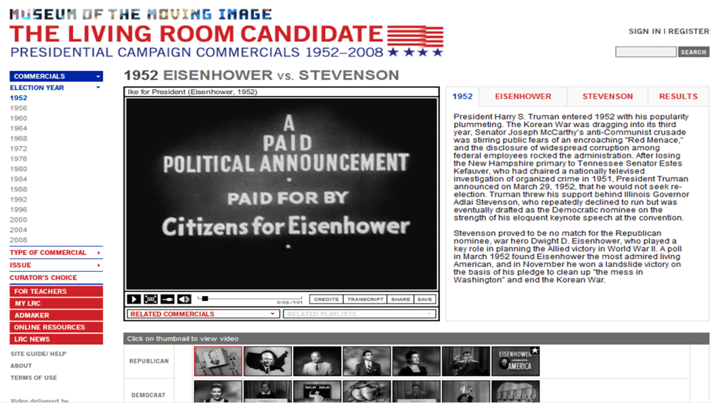 I visited the Museum of The Moving Image earlier today. I was really impressed by one of their online resources, an online archive of presidential campaign videos from 1952-2008. What struck me about this archive was that it provided a fascinating, at times captivating insight into social, political and media history.
